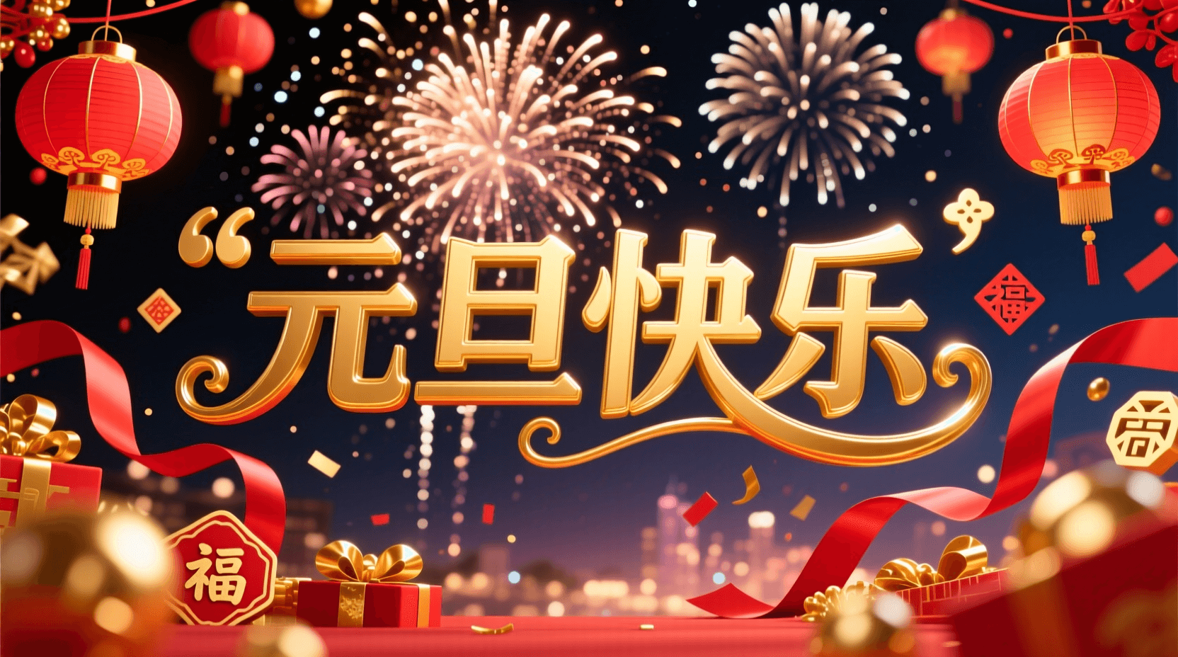 | ”一个庆祝元旦的海报,背景是璀璨的烟花照亮夜空,前景有华丽的金色'元旦快乐'字样,周围点缀着红色和金色的装饰元素,如灯笼、飘带和新年符号,整体风格喜庆而温馨。“ |