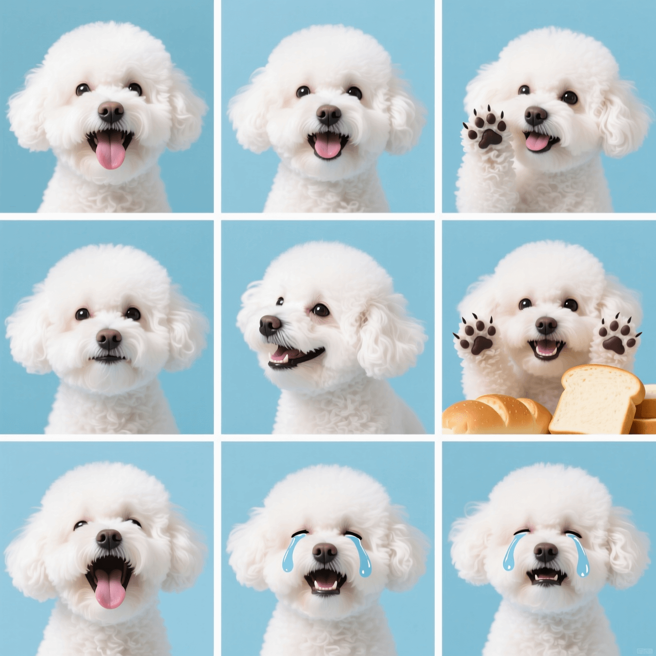 | ”浅蓝色为背景,采用九宫格排版,展示了一只白色比熊狗的九种不同表情。第一排从左到右,宠物先是吐着舌头,露出开心的模样;接着嘴巴微张,似在温和表达;然后一只爪子靠近脸部,神情可爱,微吐舌头。第二排,宠物先保持着平静的神态;随后惬意微笑;之后脑袋微侧,露出好奇的样子;最后两只爪子靠近脸部,可爱微笑;搭配面包元素。第三排,打哈欠的表情;伤心哭泣的表情;每一种表情都生动鲜活,将宠物的“小情绪”细腻展现。真实写真。“ |