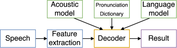 传统的语音识别需要把语音转换成语音特征向量,然后把这组向量通过机器学习,分类到各种音节上(根据语言模型),然后通过音节,还原出最大概率的语音原本要表达的单词,一般包括以下模块: