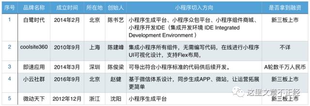 我们发现上述的五家公司中有三家是在小程序内测开始就布局小程序生成平台,而剩下的两家是后续跟进,甚至有一家是最近才开始发布他们的生成平台。这里边有几个有意思的现象。