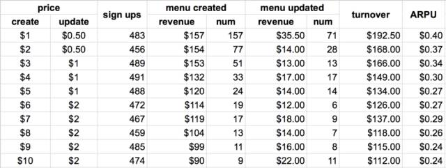 看上去并不是什么巨大的成功是吧?不过对于我来说已经足够满意了,这充分证明了,这个解决方案人们是愿意掏出自己口袋里的钱购买的。你同时也可以从数据上看出来,我在价格上做了一些调整,将“菜单制作费用”列为从 4 美金到 6 美金不等,这么做我是为了想通过调价,更清楚的捕捉到市场在“产品”及“价格”这两者之间的微妙关系。