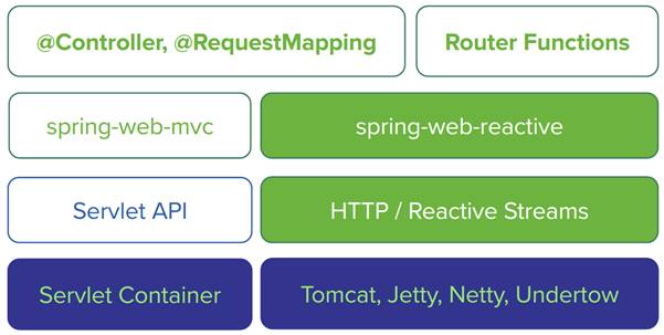 两种编程模型都是基于吧非阻塞HTTP运行时转化为Reactive Steams API。下图展示了服务器端技术栈。左边是传统的基于Servlet的Spring MVC(spring-web-mvc)以及右边的响应式技术栈(spring-web-reactive)。
