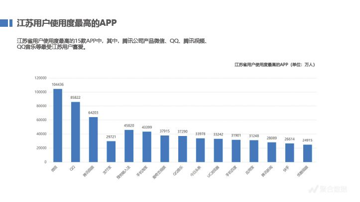 手机已经成为我们生活的必需品,特别是在“新四大发明”兴起以后,出行、餐饮、支付、社交等各类移动手机应用,丰富了人们的生活方式,为衣食住行提供便利。 聚合数据发布《江苏互联网指数分析报告》,通过研究江苏省手机用户流量使用情况,分析江苏用户手机品牌偏好、手机APP使用情况、以及江苏用户碎片化阅读时间。从多个维度,了解江苏13个城市的行为偏好。 通过对年龄分布的对比分析我们发现,95后、85后、85前三代人,在手机品牌选择上存在代沟。95后钟爱OPPO、85后钟爱iPhone、85前则钟爱华为,你是小鲜肉还是老腊肉?你的手机已把你出卖。 比起没有倾慕对象的电话号码,你更怕的应该是没有她微信!社交APP凭着庞大的用户基数,在江苏省用户使用度最高的15款APP中,拔得头筹。 除了美美美和买买买,江苏用户同样喜欢用知识武装自己。通过读书维度对比发现,江苏全省用户均喜欢使用手机阅读。如果一定要拼个高低,那么苏南恐怕略胜一筹了。数据显示,读书纬度单看总访问次数苏州和南京领先,人均访问次数前三是南京、无锡、镇江最高。 如果你对苏州的了解还停留在“上有天堂,下有苏杭”,那么小编只能说你OUT了!除了爱读书,苏州也是最精明的城市,在理财方面,苏州人都是小能手。 民以食为天,各地用户在美食方面表现得势均力敌。不过,要说最爱吃的城市,淮安、宿迁、连云港则表现的尤为突出,并不是你以为的南京,惊不惊喜,意不意外? 从《江苏互联网指数分析报告》可以看出,江苏省用户在行为习惯上确实存在差异。你的家乡是最爱玩,最爱阅读,还是最会理财?点击下方阅读原文,大数据比你更懂你的家乡。