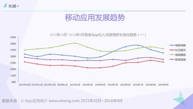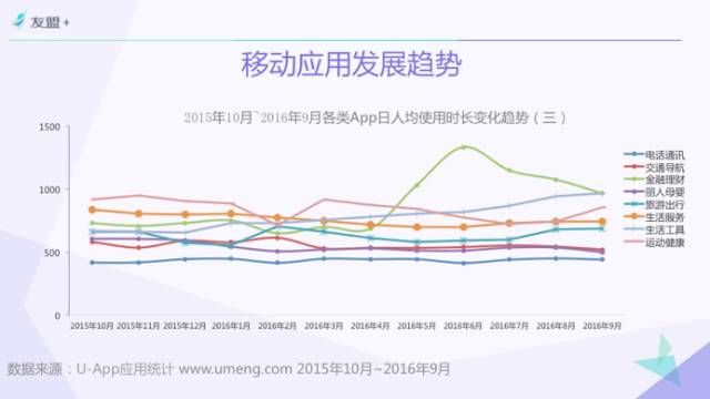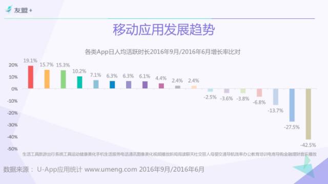 各类App用户日均活跃时长2016年9月对比6月来看,生活工具、旅游出行、系统工具、运动健康类App日人均活跃时长增幅较大,超过10%;音乐播放、金融理财、电商购物类App日人均活跃时长下降较多。