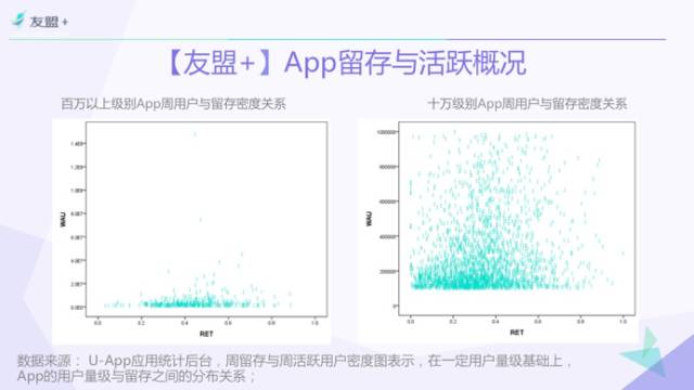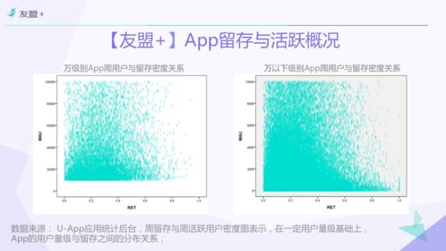从App周留存与周活跃用户的特征分布我们能够看到:百万级周活跃App的次周留存40%以上分布最为集中,十万级用户的留存则主要集中在20%至40%之间。