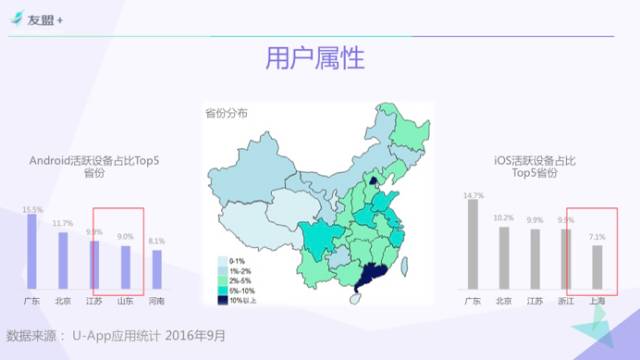 Ø Android和iOS活跃设备省份分布来看,也均是广东、北京、江苏占比最高,此外Android活跃设备山东和河南占比较高跻身前五,iOS则浙江、上海占比较高排名前五。