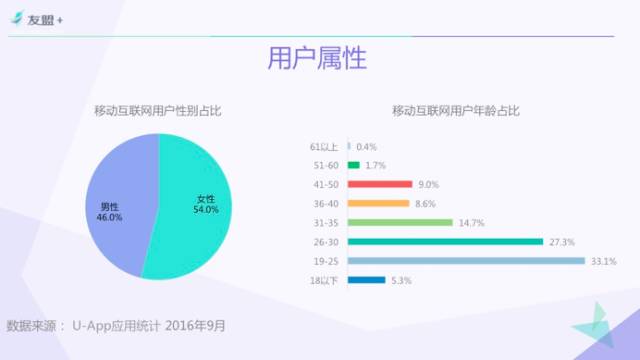 Ø 2016年9月,移动互联网活跃用户中女性偏多,占比54%,比男性高出8个百分点;