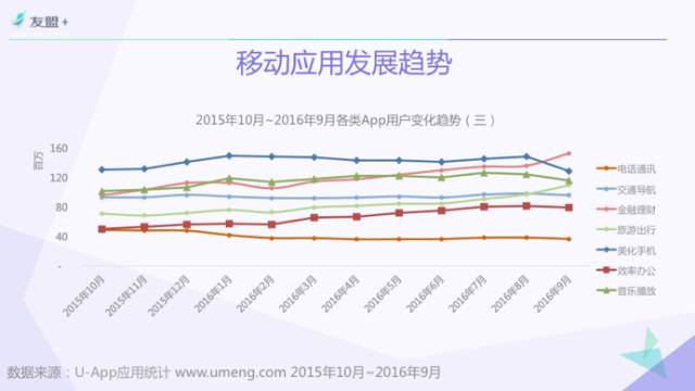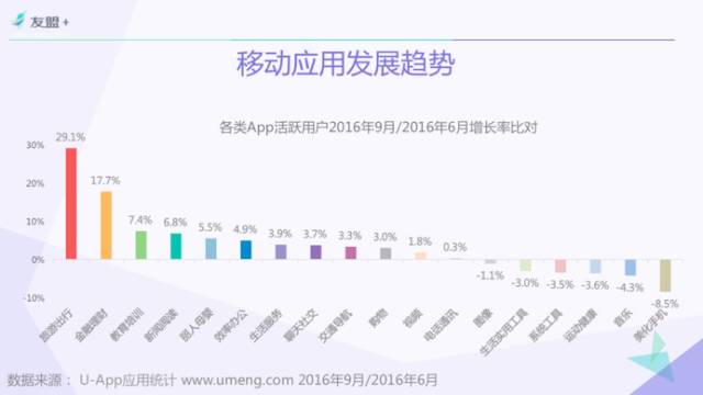 各类App活跃用户2016年9月对比6月来看,旅游出行、金融理财类App增长幅度最大,教育培训、新闻阅读、丽人母婴类App小幅增长,美化手机、音乐播放类略有下滑。