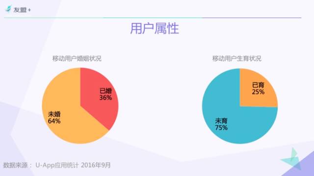 Ø 婚育分布来看,活跃的移动用户中未婚用户占据大多数,已婚用户占比36%;