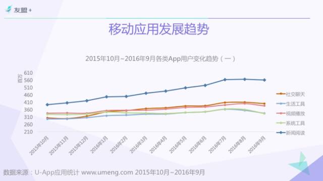 Ø 新闻阅读、视频播放、社交聊天、生活工具类应用在过去一年呈不断增长趋势,新闻阅读类增长明显,视频播放类等应用平缓增长。