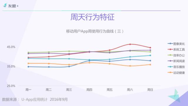 Ø 效率办公类App工作日集中使用,运动健康类也工作日集中度较高,可见用户更倾向在工作日使用运动健康类App;