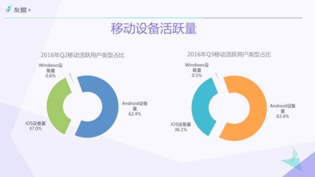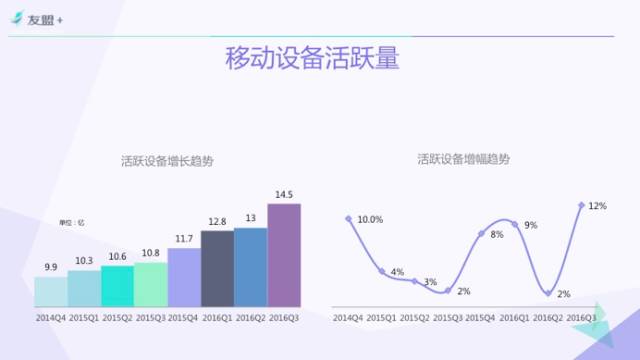 • 截至2016年Q3,国内活跃设备总量达14.5亿,对比Q2增长11.5%,移动活跃设备总规模进一步扩大;