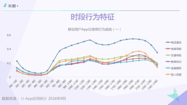 Ø 教育培训、丽人母婴类App晚间时段用户集中度较高;金融理财类App用户在每日的9:00~15:00之间使用人群较为集中,使用特征与国内股市开收盘的规律一致。