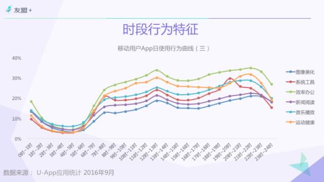 Ø 运动健康类App午间和晚间用户集中度较高;音乐播放类应用晚间时段用户集中度较高。
