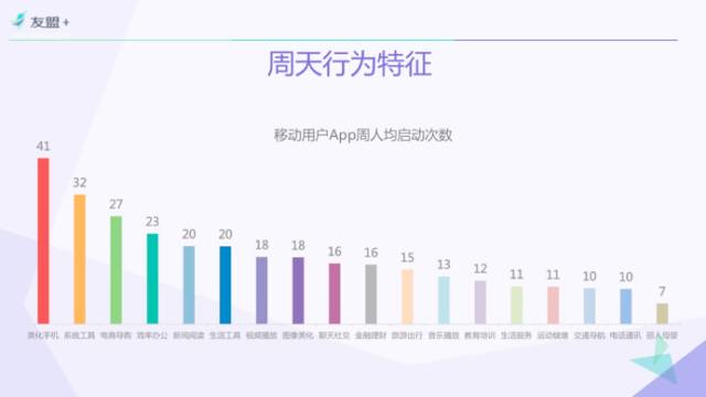 从周使用行为看,移动活跃用户周使用频次最高的App类型是美化手机、系统工具、效率办公、新闻阅读、生活工具类日常使用的App,以及电商导购类App。