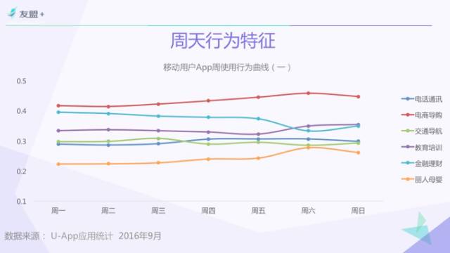 Ø 金融理财类App受国内股市开盘影响,周一到周五使用集中,周末下降明显;电商导购类App周末用户集中度略有提升。