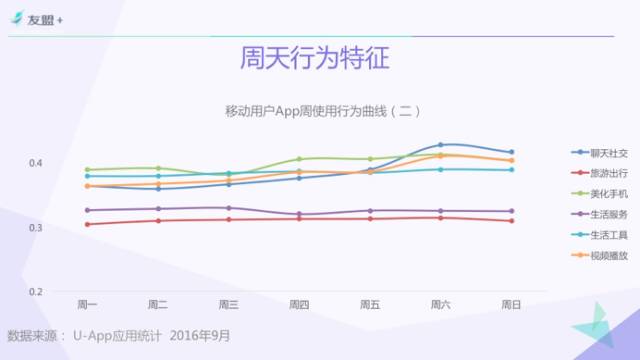 Ø 社交聊天、视频播放类App周末用户集中度较高。