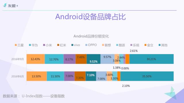 Android设备品牌分布方面,2016年9月对比6月来看: